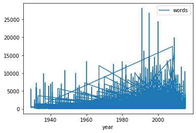 Now we can start to try answering our questions. For example, we could use the groupby() method to group the data by the year column and then use the sum() method to sum the words column.