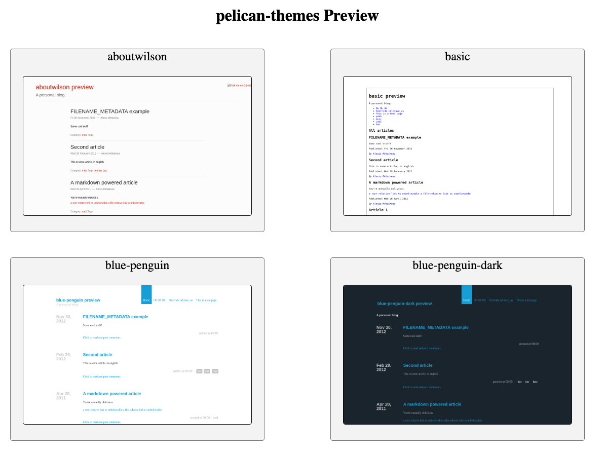 This will list all the themes we have currently installed. But we can also take a look at curated lists of available themes that we could install. To do that we can visit, the Pelican Themes preview site https://pelicanthemes.com/ and take a look at what is available.